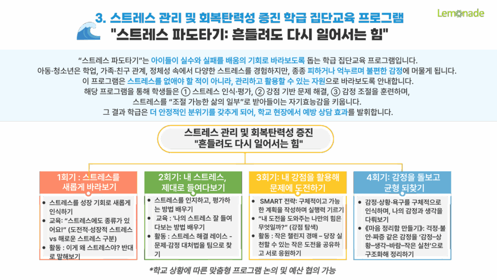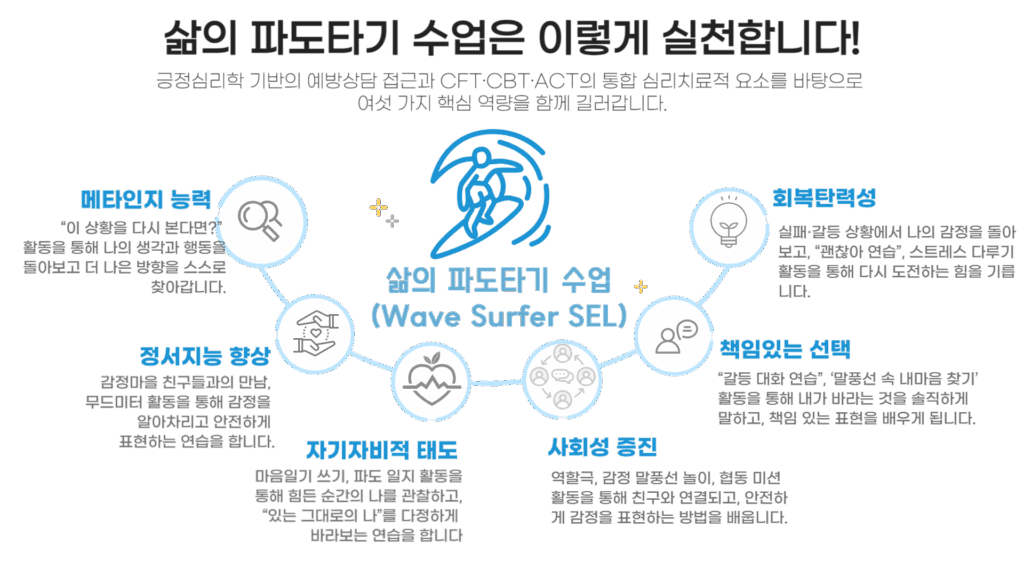 삶의 파도타기 수업은 단순한 심리교육이 아니라, 예방상담 관점을 토대로 학생들이 정서적 어려움과 갈등을 스스로 다루는 힘을 기르도록 돕는 사회정서학습(SEL) 기반 프로그램입니다.